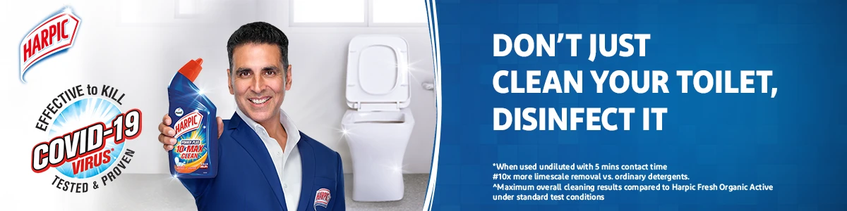 Harpic All in One is the one-stop shop for all toilet cleaning needs. Unlike ordinary cleaners, it combines the benefits of tough stain removal, 99.9% germ kill, and freshness. The result is a sparkling clean, hygienic, fresh, and germ-free toilet without any malodour with every use of Harpic. 5x power action: 5 times better at limescale removal vs. ordinary cleaners. Helps eliminate malodour. Clings to attack stains. Kills all germs. India’s #1 Toilet Cleaner*. Always use Harpic toilet cleaner separately. Do not mix with other products. *Harpic claim as per Nielsen Retail Index data for the period MAT Oct ’20 for the Indian market in Cleaners – Toilet & Bathroom Category. ^Please refer to the individual pack for details. #Kills 99.9% germs post 5 minutes contact with undiluted product.
