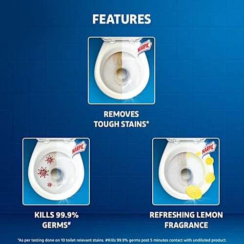 Harpic All in One is the one-stop shop for all toilet cleaning needs. Unlike ordinary cleaners, it combines the benefits of tough stain removal, 99.9% germ kill, and freshness. The result is a sparkling clean, hygienic, fresh, and germ-free toilet without any malodour with every use of Harpic. 5x power action: 5 times better at limescale removal vs. ordinary cleaners. Helps eliminate malodour. Clings to attack stains. Kills all germs. India’s #1 Toilet Cleaner*. Always use Harpic toilet cleaner separately. Do not mix with other products. *Harpic claim as per Nielsen Retail Index data for the period MAT Oct ’20 for the Indian market in Cleaners – Toilet & Bathroom Category. ^Please refer to the individual pack for details. #Kills 99.9% germs post 5 minutes contact with undiluted product.